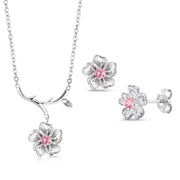 925 Sterling Silver Cherry Blossom Necklace Set, Cherry Blossoms Set, Silver Cherry Blossoms Flower Earrings Necklace Set