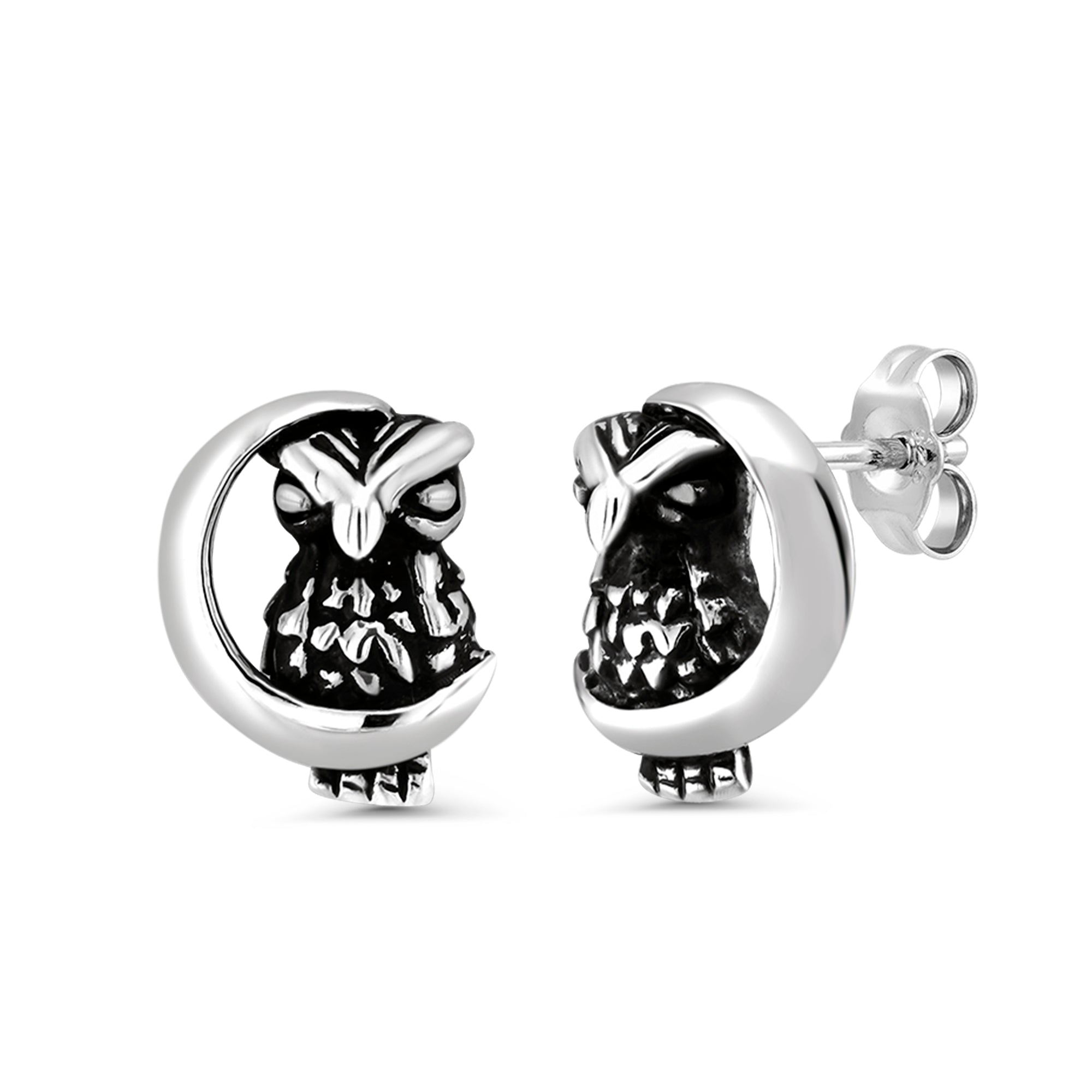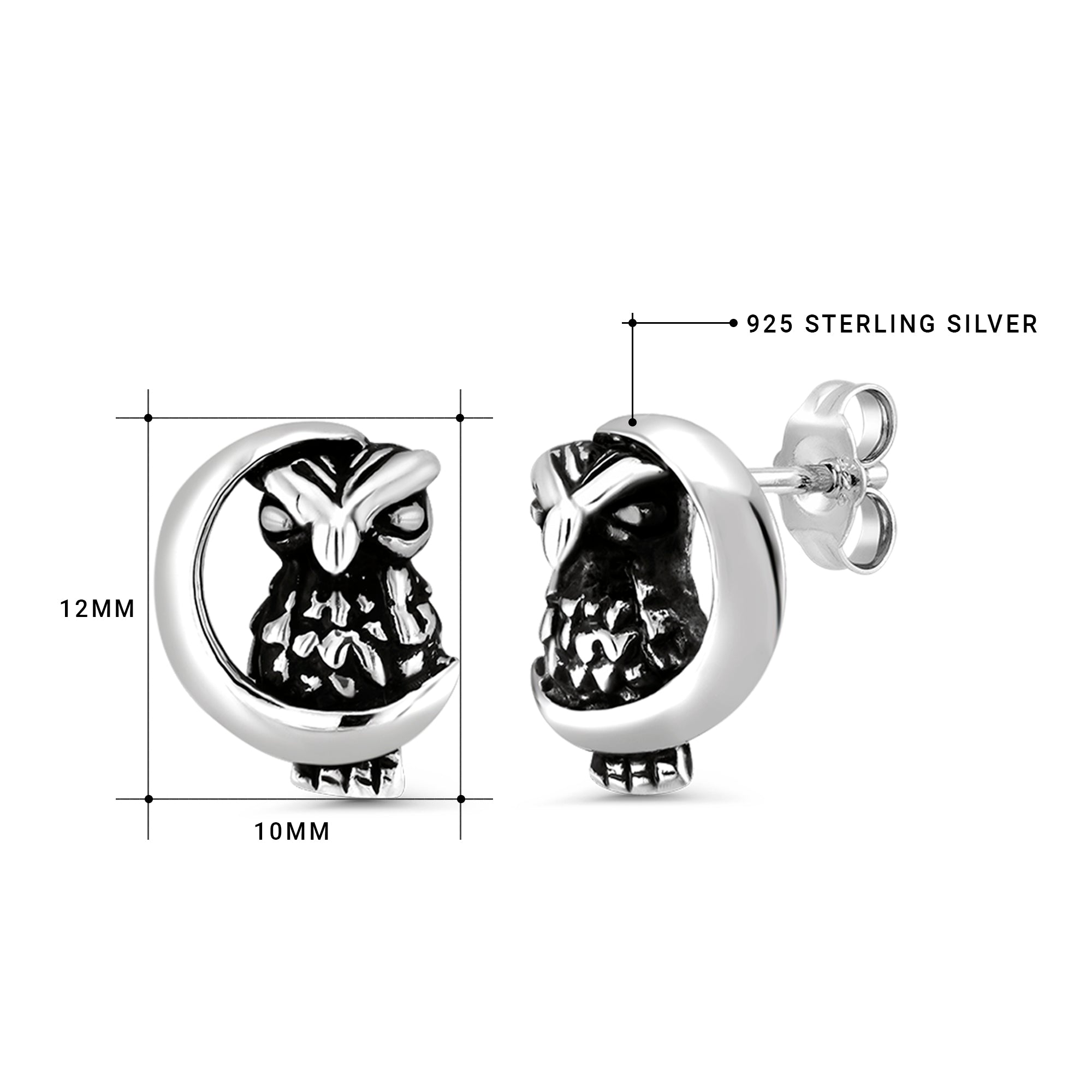 925 Sterling Silver Owl On The Moon Studs, Silver Owl Studs, Dainty Owl Studs, Oxidize Studs, Owl On The Moon Studs, Hypoallergenic Stud Earrings