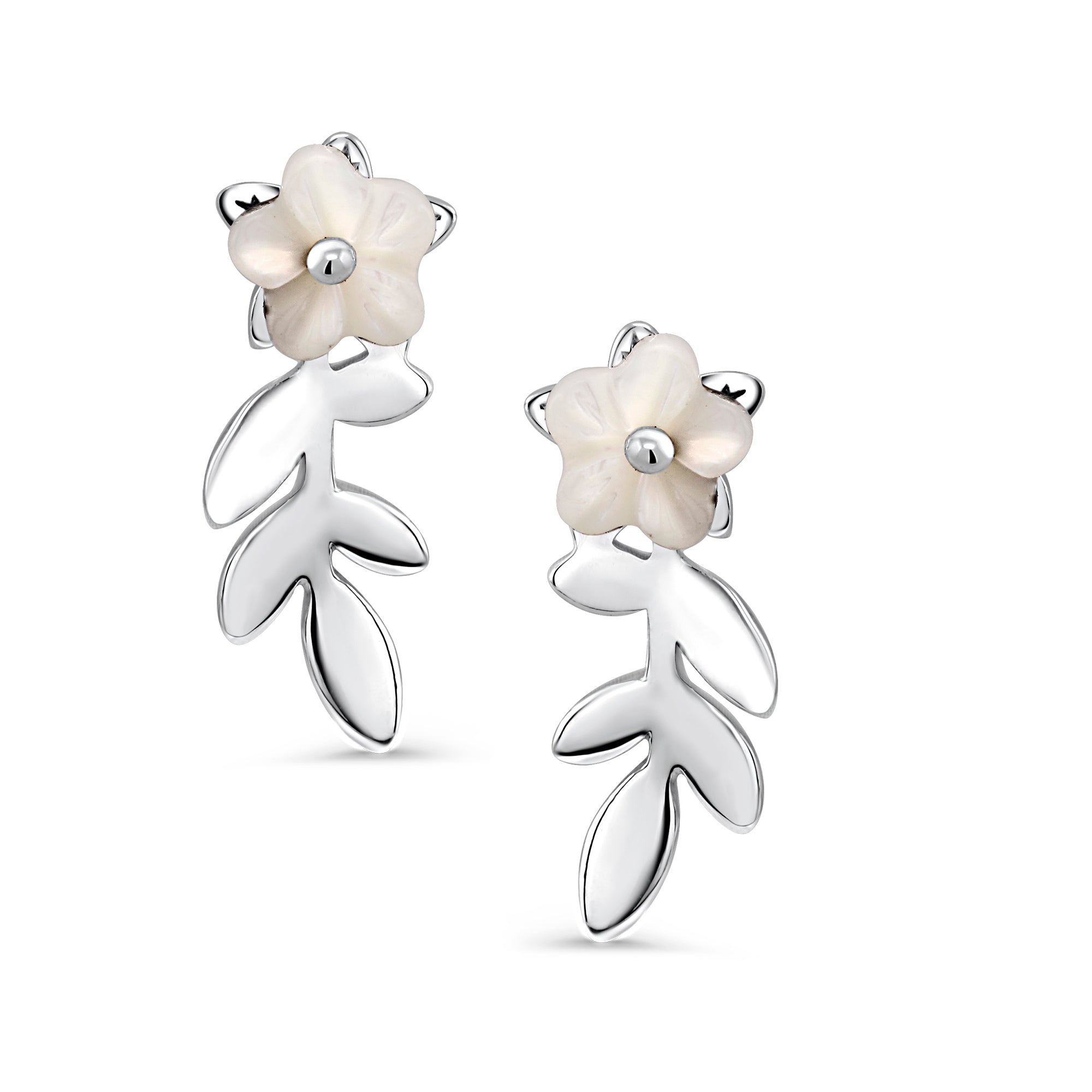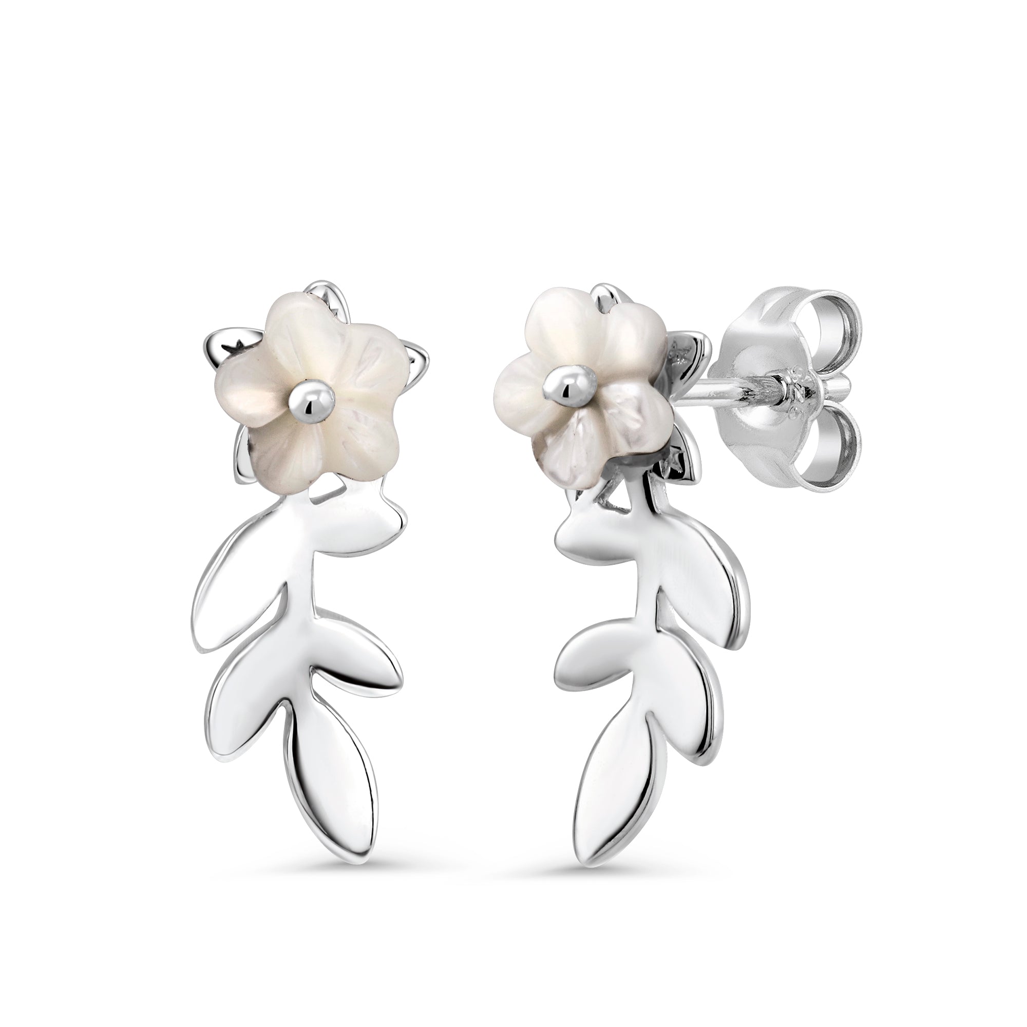 925 Sterling Silver Flower With Leaf Stud Earrings, Mother Pearl Flower Stud Earrings, Flower Earrings, Hypoallergenic Flower Earrings, Floral Earrings